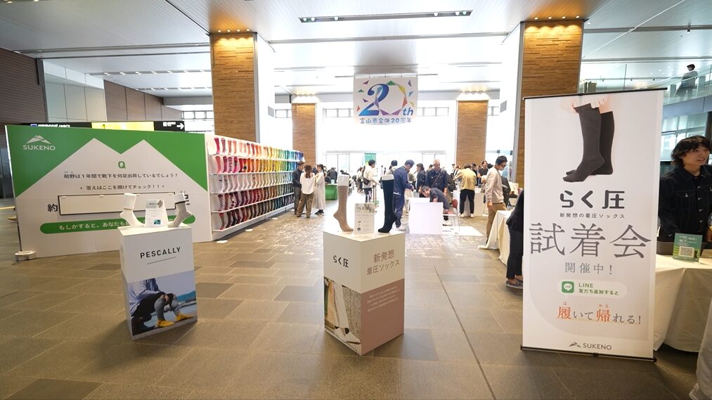 2025年10月13日(月・祝)に富山駅構内にて、着圧ソックス「らく圧」をテーマにした体験型イベント「履いて・みて・感じる SUKENOのらく圧お試しフェスタ」を開催しました。