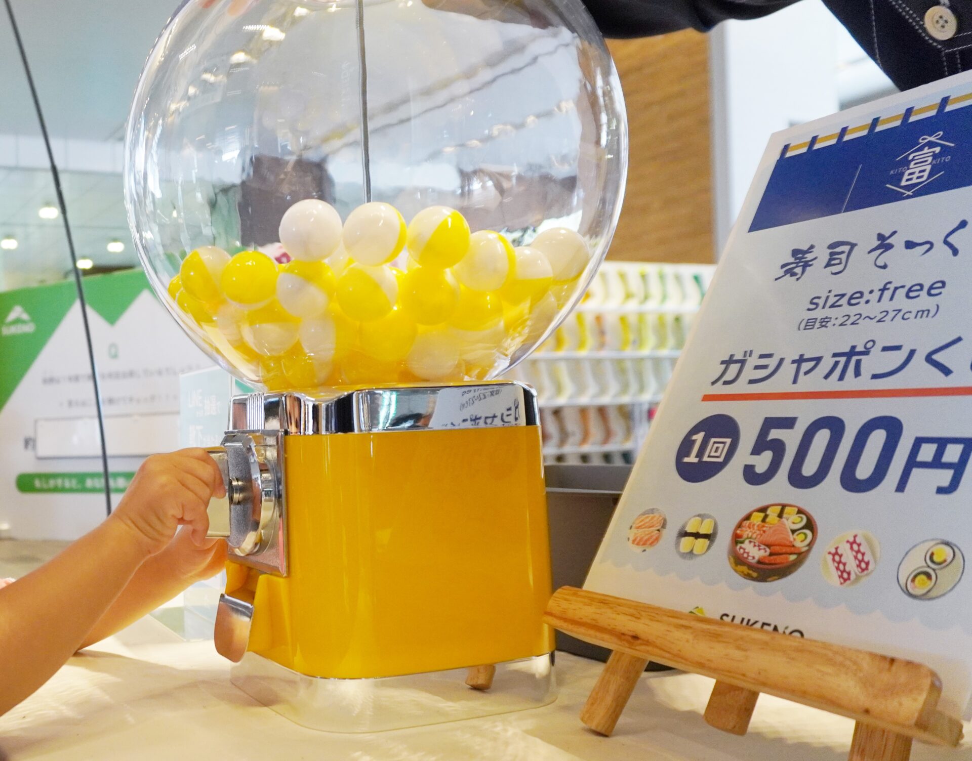 お寿司そっくりな「寿司そっくす」や新幹線のかたちの「のりものそっくす」が当たる、ガシャくじも大人気。大当たりが出た瞬間は大盛り上がりでした。