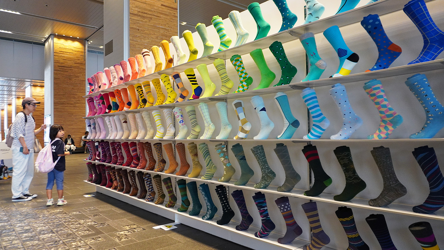 すべて違う色柄の靴下100足がずらりと並んだフォトスポット。「100足数えてみよう」と楽しげなご家族など、目にしたときの皆さまの笑顔がとても印象的でした。